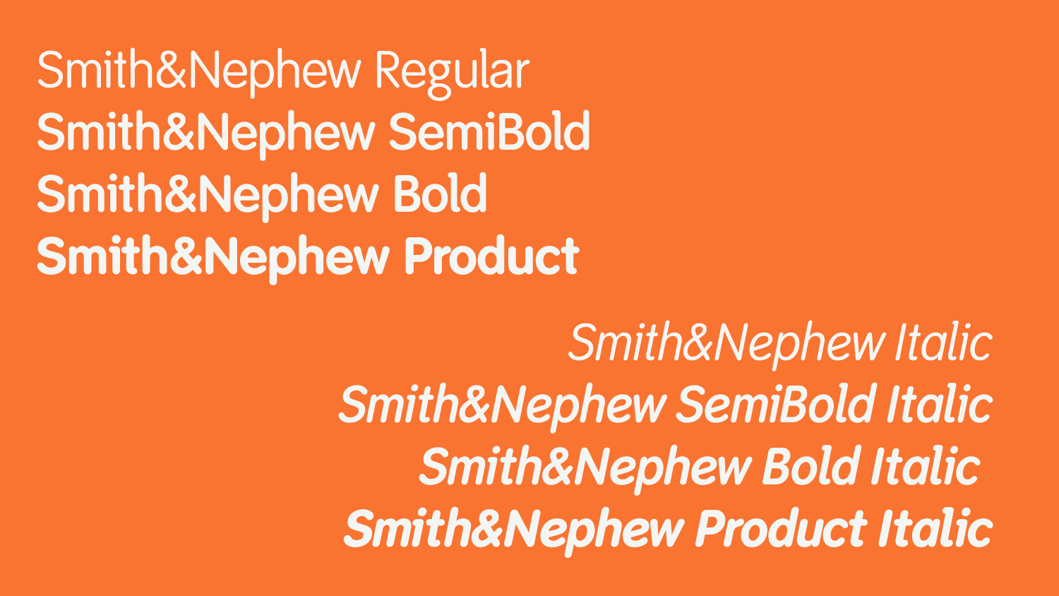 The initial design of the Smith & Nephew typeface in 2003 was an international, creative collaboration between Smith & Nephew in the UK, Wolff-Olins in New York city, and in the San Francisco Bay Area, FontShop with Delve Fonts.