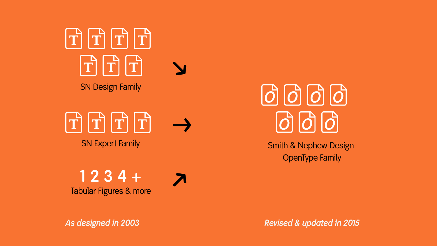 The typeface has since been updated by Delve Fonts, adding support for several more languages—including Cyrillic for Russian, eliminating redundancy (due to the limitations of legacy formats), minor revisions to improve legibility, especially at smaller point sizes, plus adding the OpenType features and classes that bring ease-of-use and increased consistency. Overall, the latest version of the Smith & Nephew typeface provides a better user experience, exceeded their expectations, and is a shining example of how we stand by our work over the lifetime of the typeface.